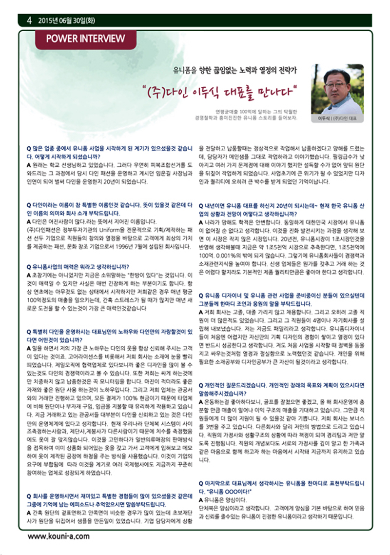 "유니폼을 향한 끊임없는 노력과 열정의 전략가" (주)다인 이두식 대표를 만나다 / KOUNIA 4호. 2015-6-30
