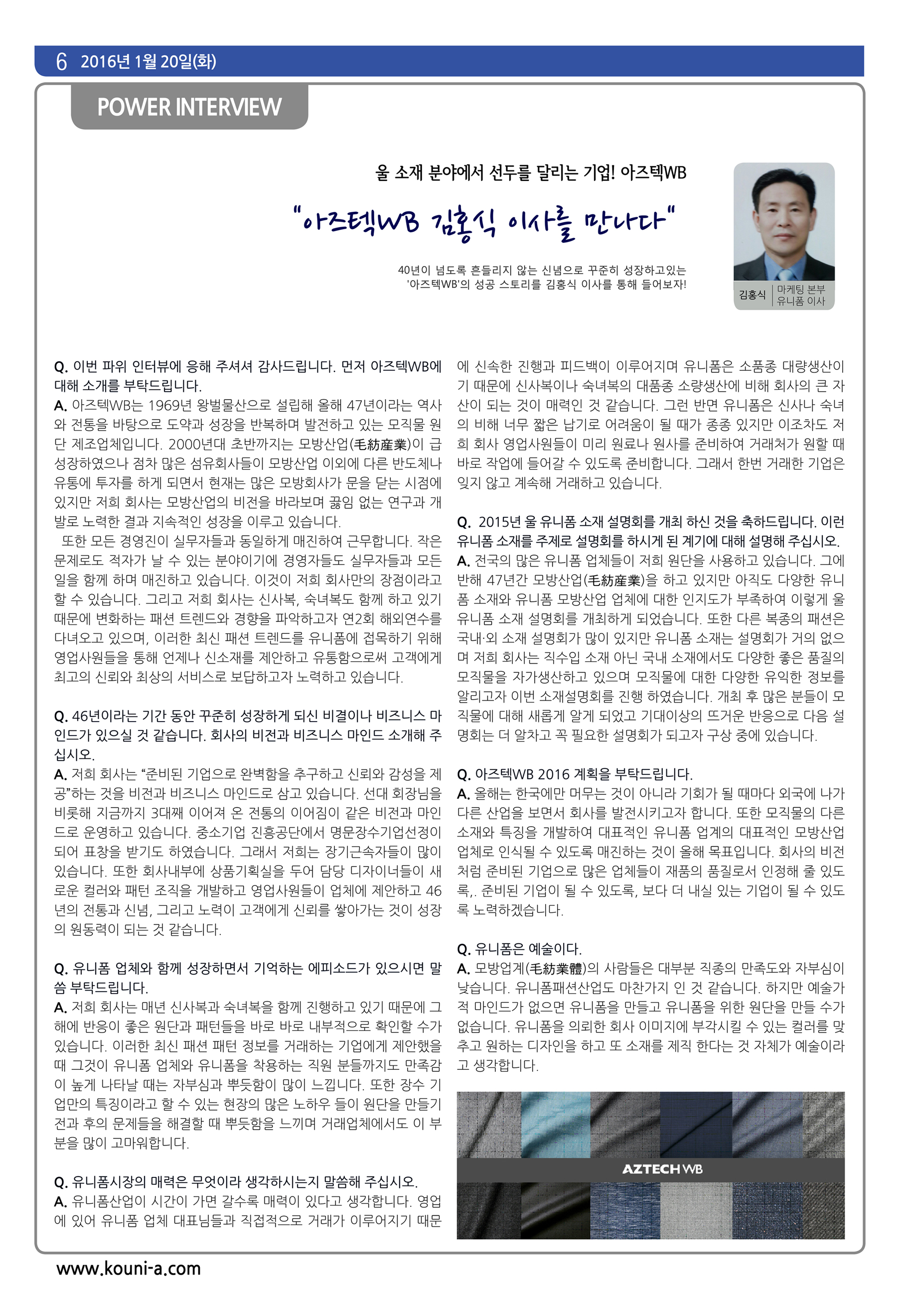 "울 소재 분야에서 선두를 달리는 기업 아즈텍WB" 김홍식 이사를 만나다 / KOUNIA 5호. 2016-1-20